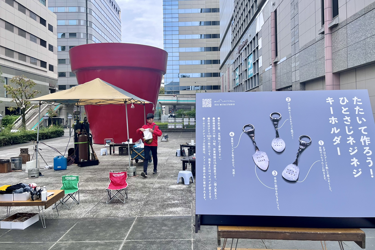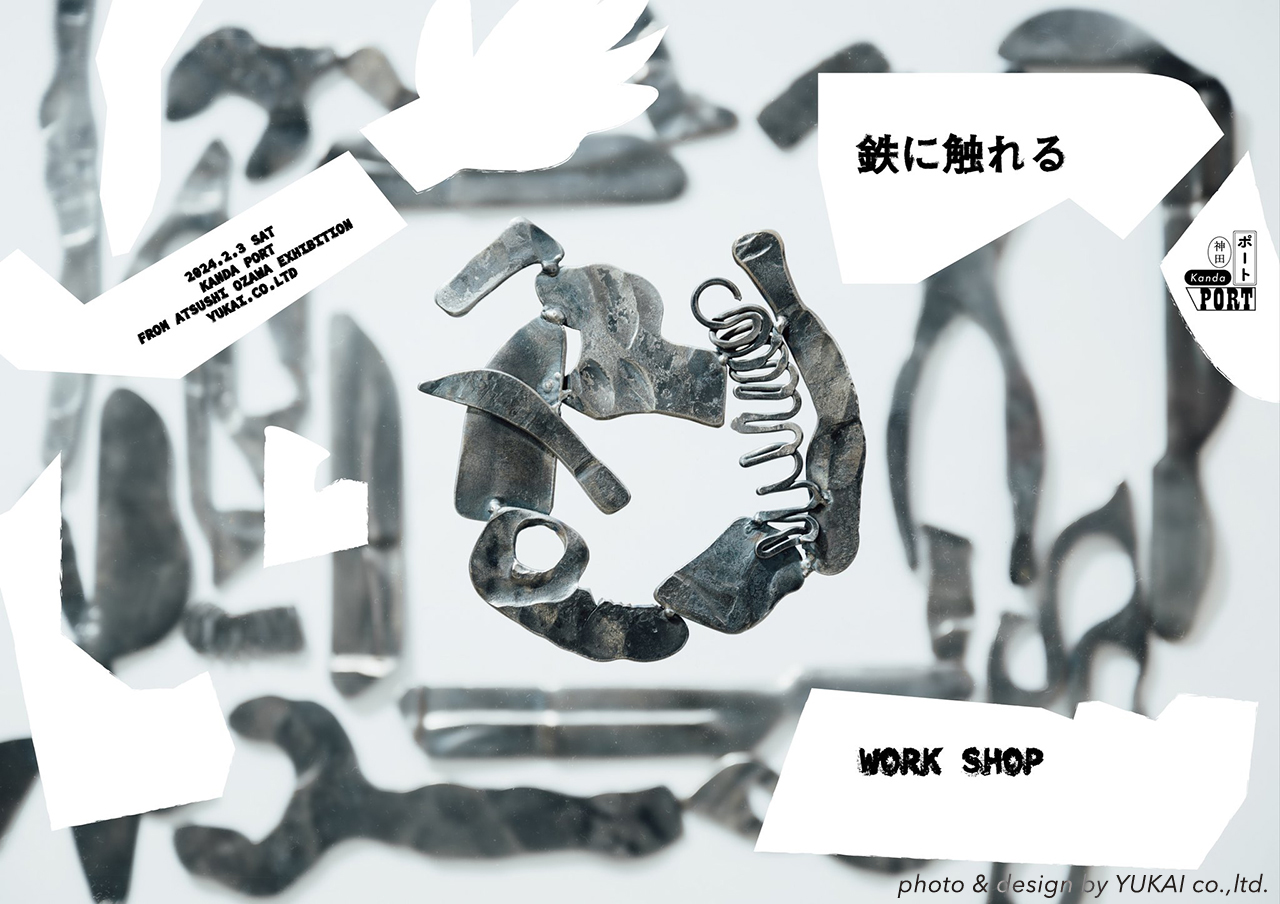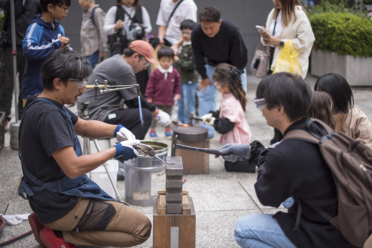 鉄の端材を溶接でつなぎ合わせて、「生き物」をテーマとしたレリーフ作り。叩くのとはまた違った、鉄のリアリティを感じるワークショップ。端材は過去に金沢の「野鍛治の門冠」を作った時に出たもので、このワークショップの収益は能登半島地震の被災地への寄付金とした。