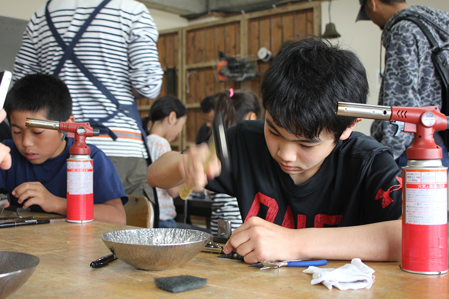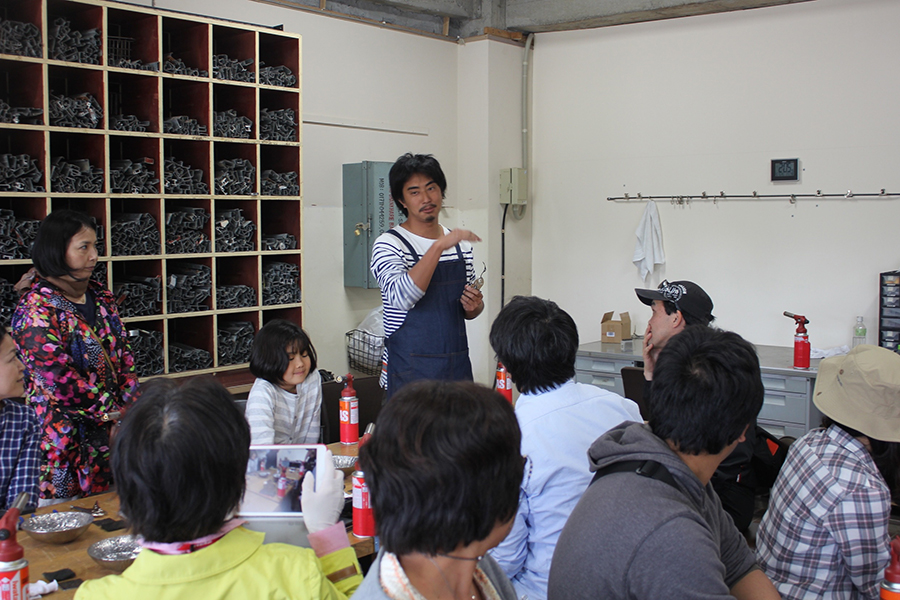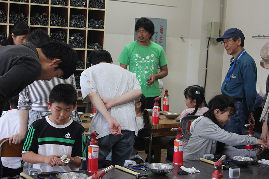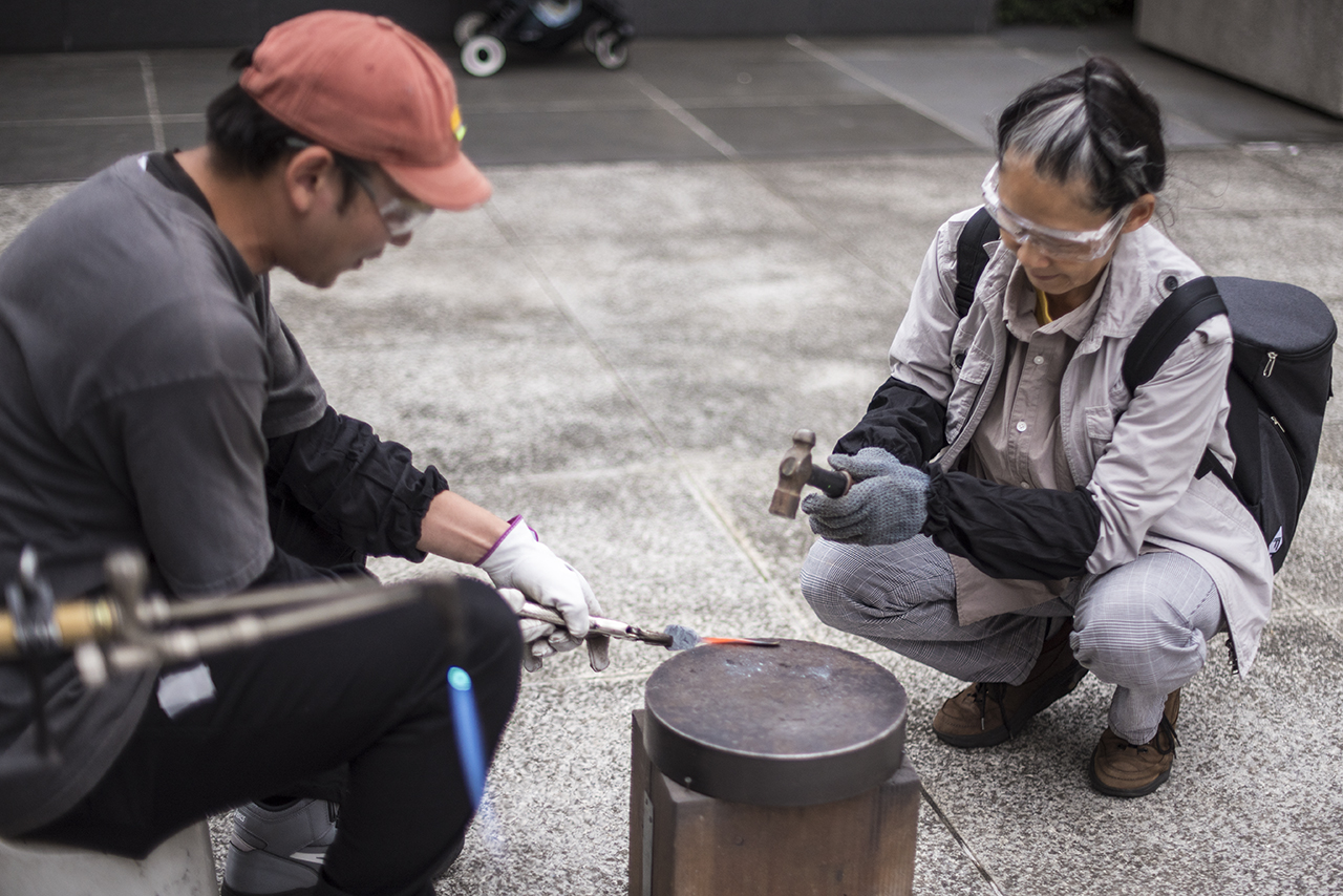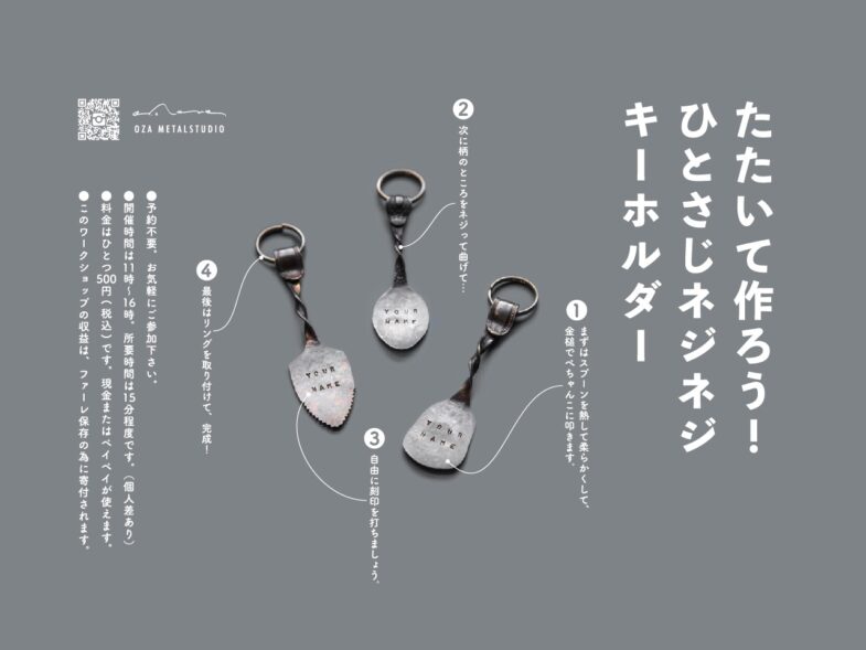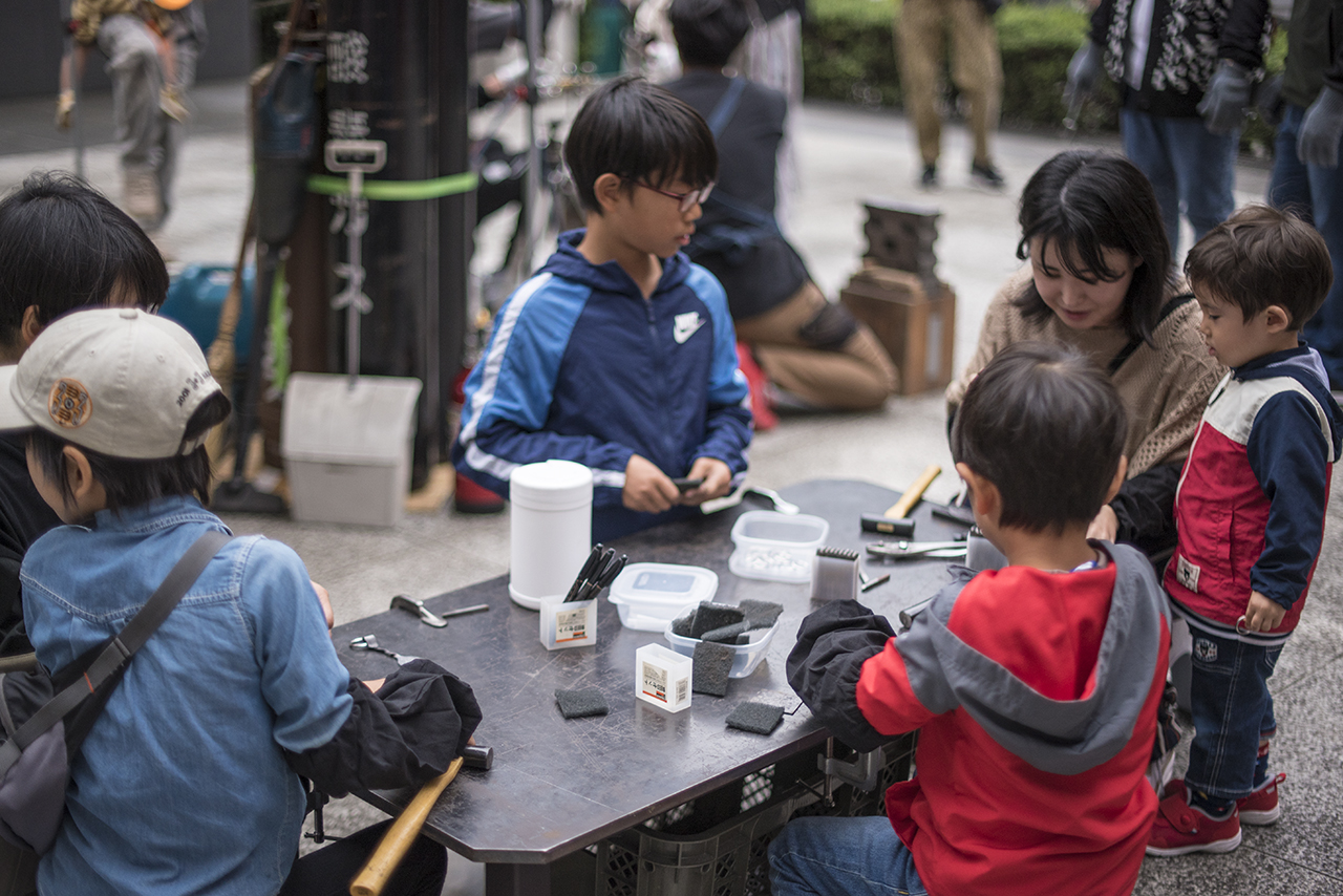 鉄の端材を溶接でつなぎ合わせて、「生き物」をテーマとしたレリーフ作り。叩くのとはまた違った、鉄のリアリティを感じるワークショップ。端材は過去に金沢の「野鍛治の門冠」を作った時に出たもので、このワークショップの収益は能登半島地震の被災地への寄付金とした。