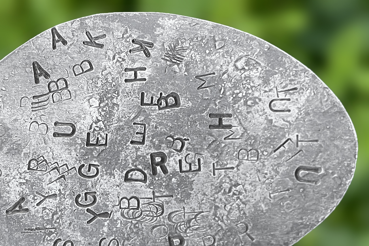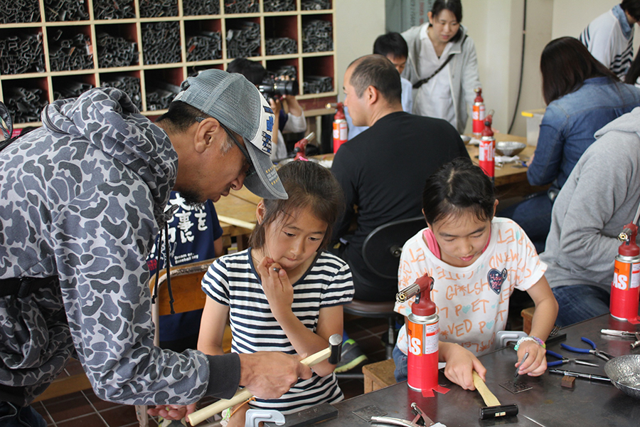 熱した鉄は柔らかい…と言っても、飴細工のようにフニャフニャにまではならず、叩いて変形させるにはそれなりの力が要る。そんな中、スプーンは小さく薄いので、小さなお子様でも変形させられるアイテムである。さじの部分を平らにしながら、柄の部分をネジネジに。仕上げにお好きな刻印を打って完成。