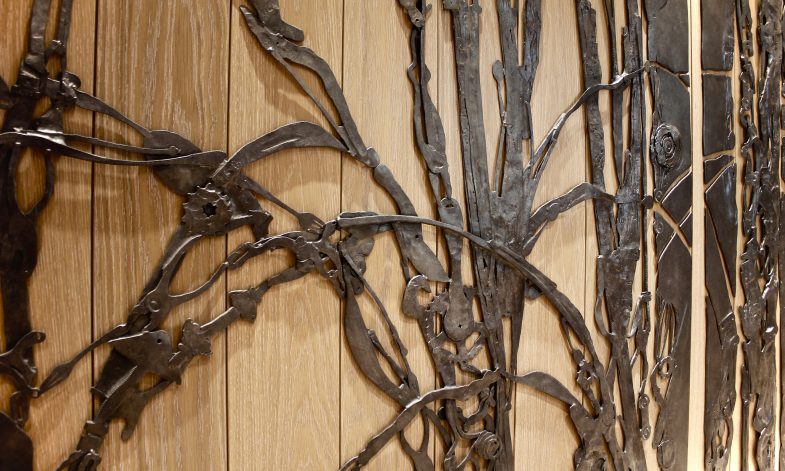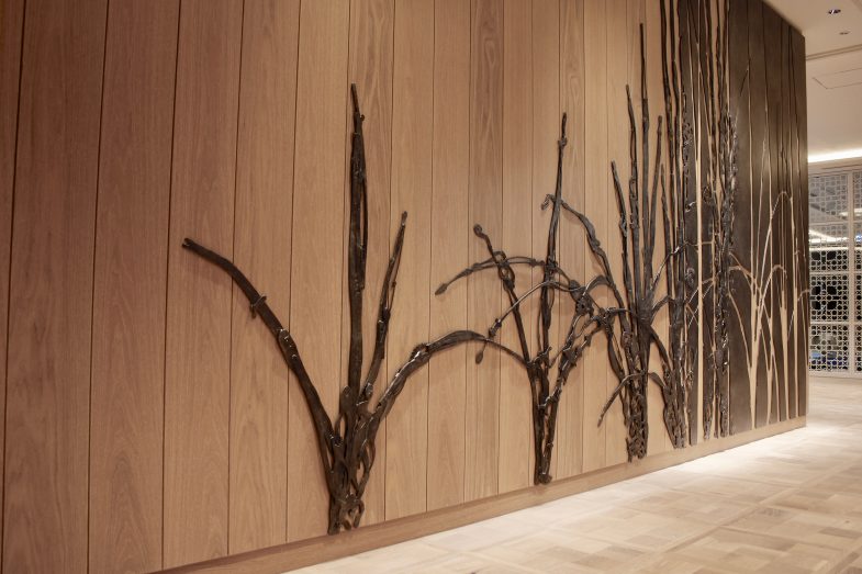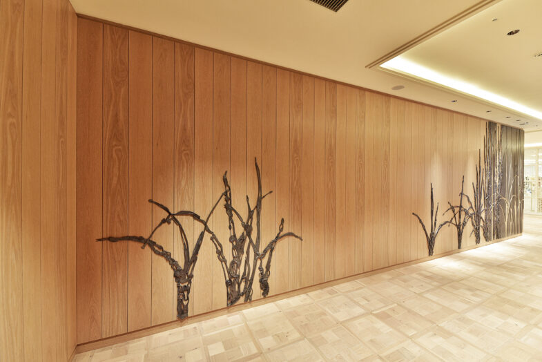 The iron artwork installed here will also be a work in which contrasting images are mixed and fused. Among the innumerable hanging leaves, the image that spreads to the left side of the wall is on the ground, daytime, and outdoors. The iron tools (= artificial objects) that have finished their role are heated and beaten to the flat, and after reconstruction, the reproduction to natural objects is expressed. On the right side of the wall, the outline of the leaves is cut out from the iron plate, and the image of underground, night, and indoors are put in.
