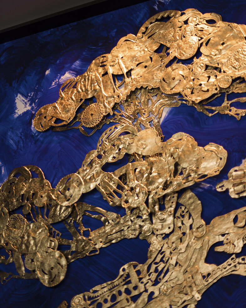 硬質なイメージの鉄製品を熱して叩くことで、有機的なフォルムに変えていく。うねうねとした金槌の痕跡は鉄たちの脈拍。これらを繋ぎ合わせ、樹木のフォルムに再構築する。一連のプロセスは「人工物を自然物に戻す」行為とも言える。