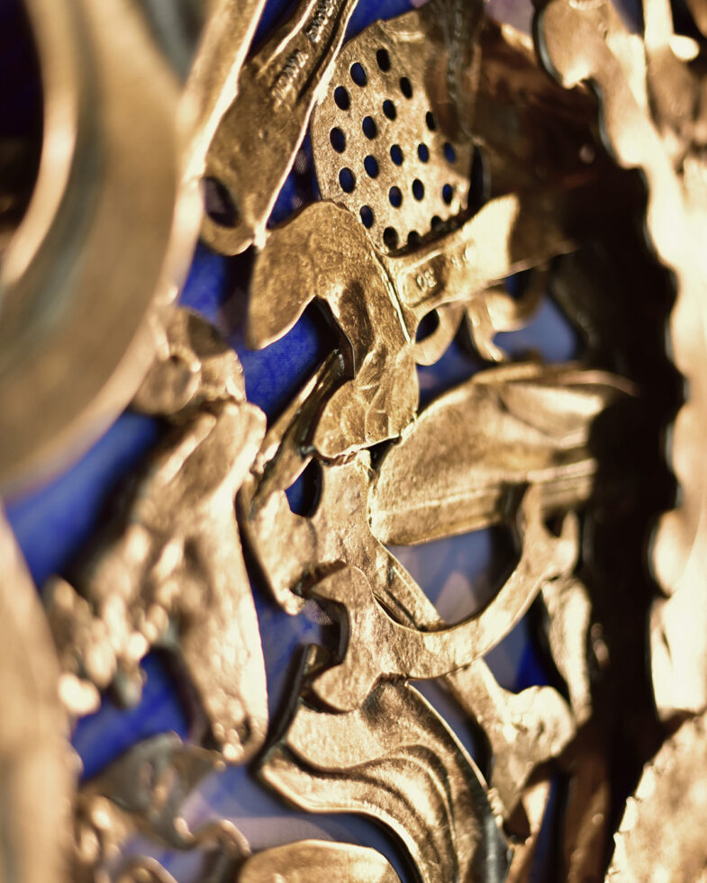 This “hitting” is a process that is the exact opposite of the field smiths who melted iron sand and hit it to make tools. After this, the figure applyed with gold leaf will have some nostalgia and simplicity while being gorgeous. The contrasting images are fused together as an indication of Kanazawa’s industry, and become a presence that welcomes travelers as a *Gate crown pine tree.