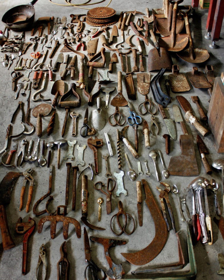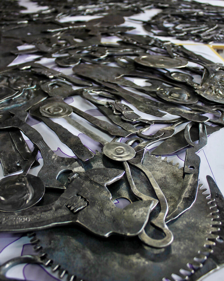 本作品は実際に現地を巡って集めた鉄の古道具を材料としている。