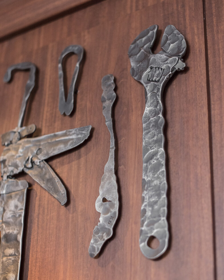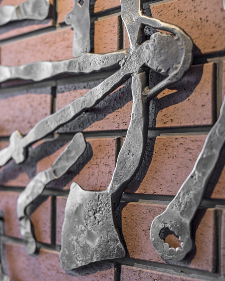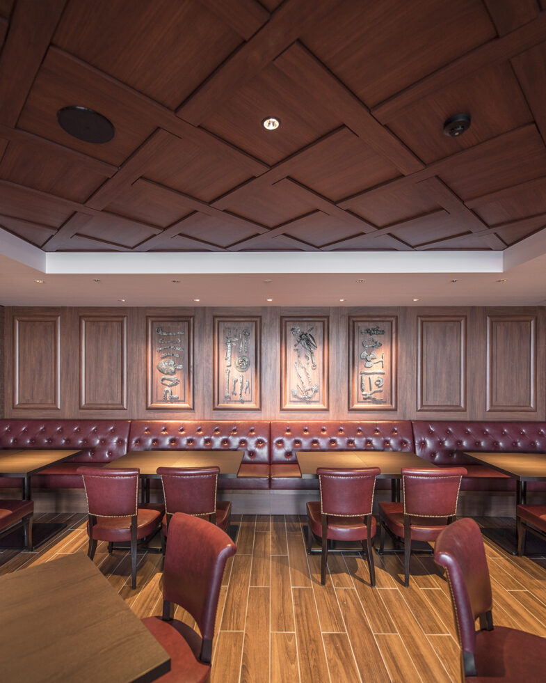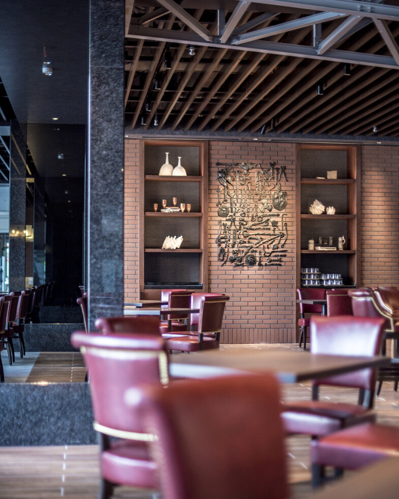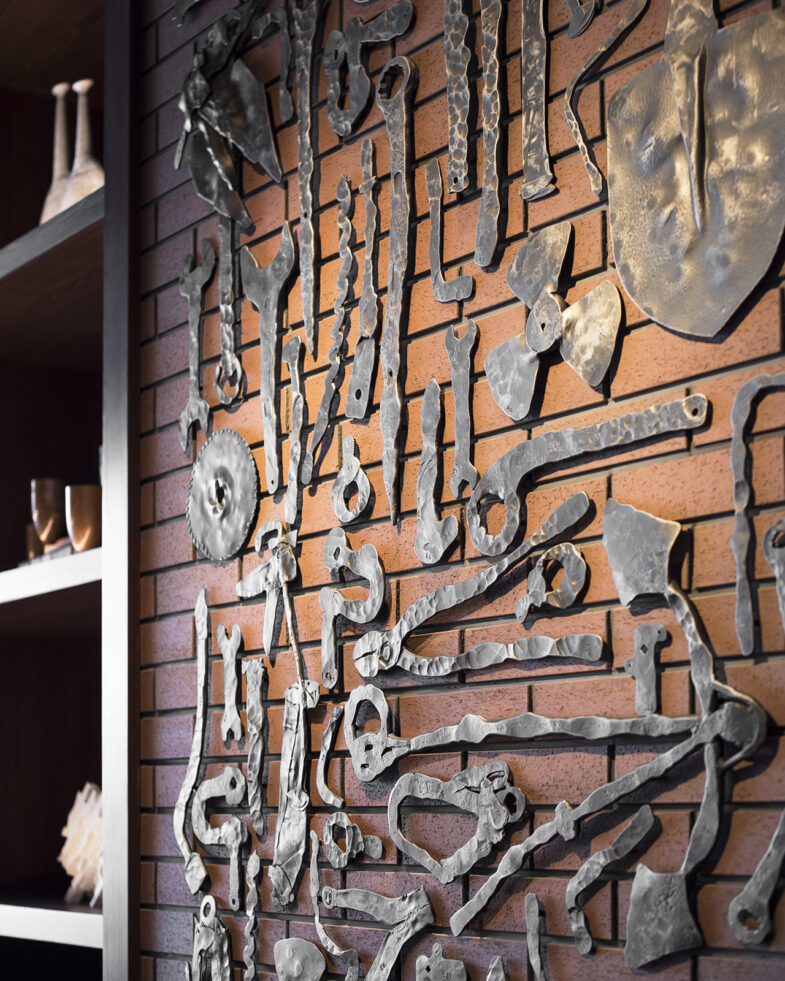 みなとみらいに開業したヒルトン横浜2F、BAYDECK ~BEER&GRILL~へ。この地域は大規模な埋立地で、かつては造船所があった場所でもある。船具や漁具、土木業に使う工具をぺちゃんこに叩き、みなとみらいの歴史を連想させるレリーフを設置した。