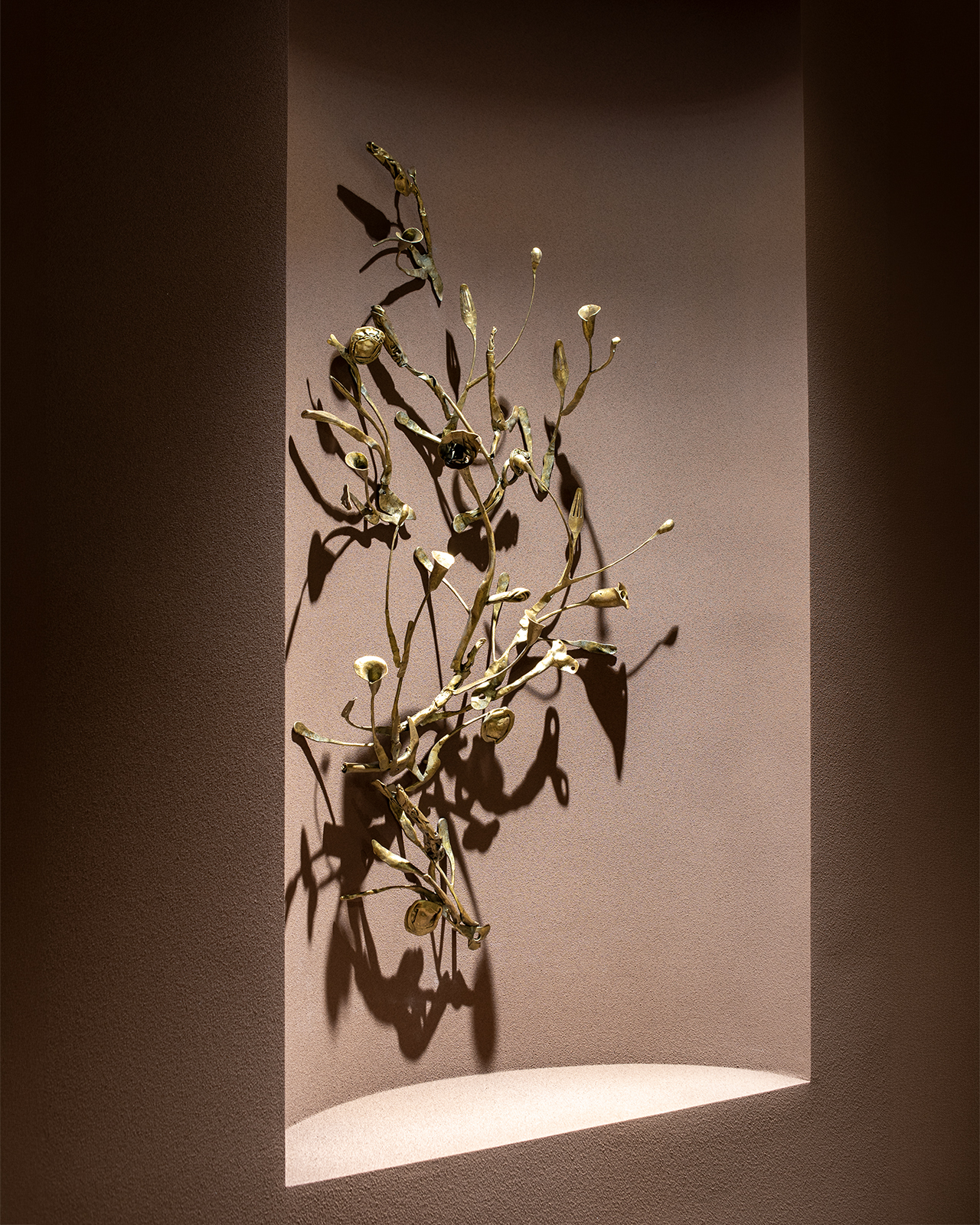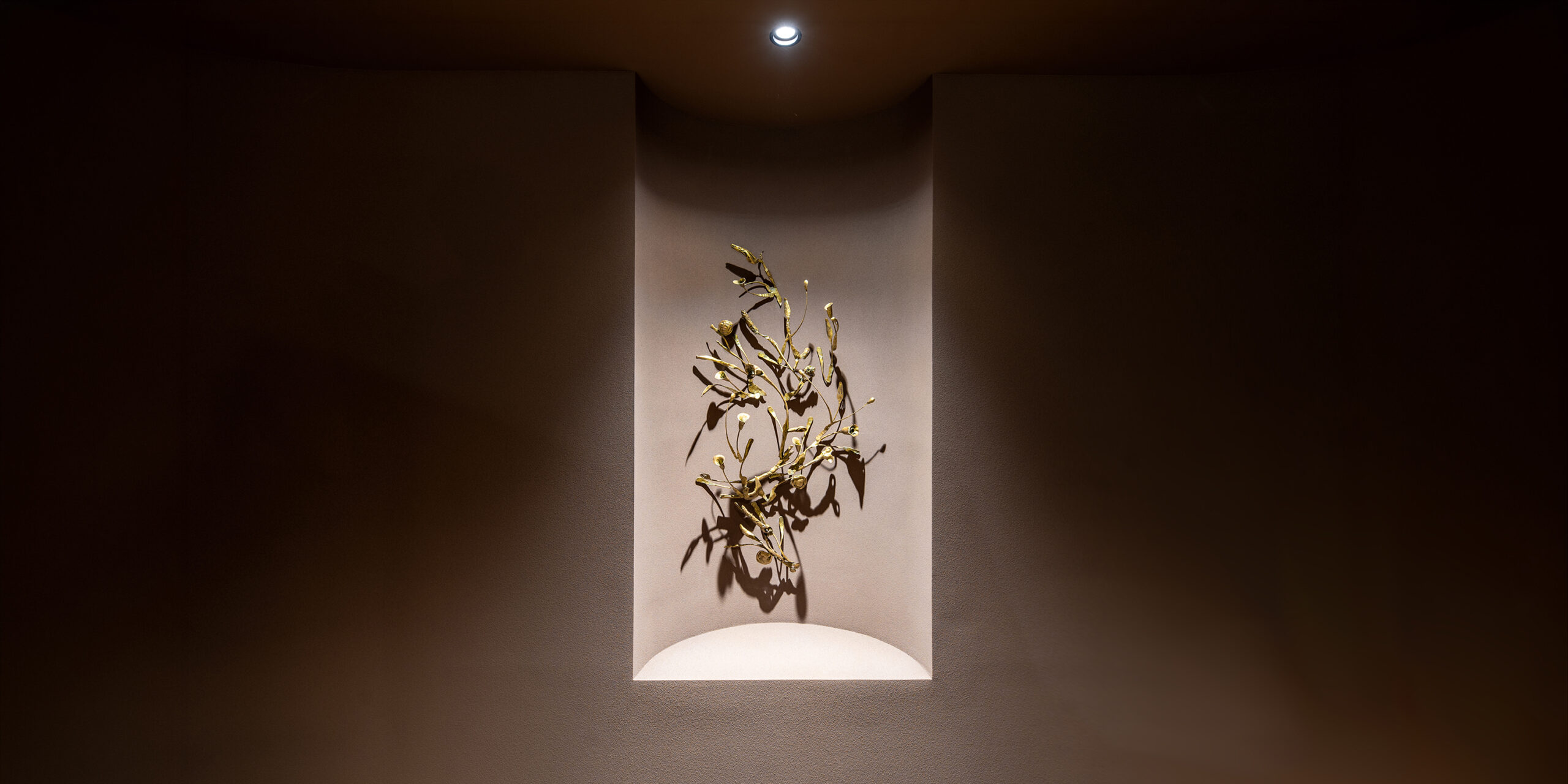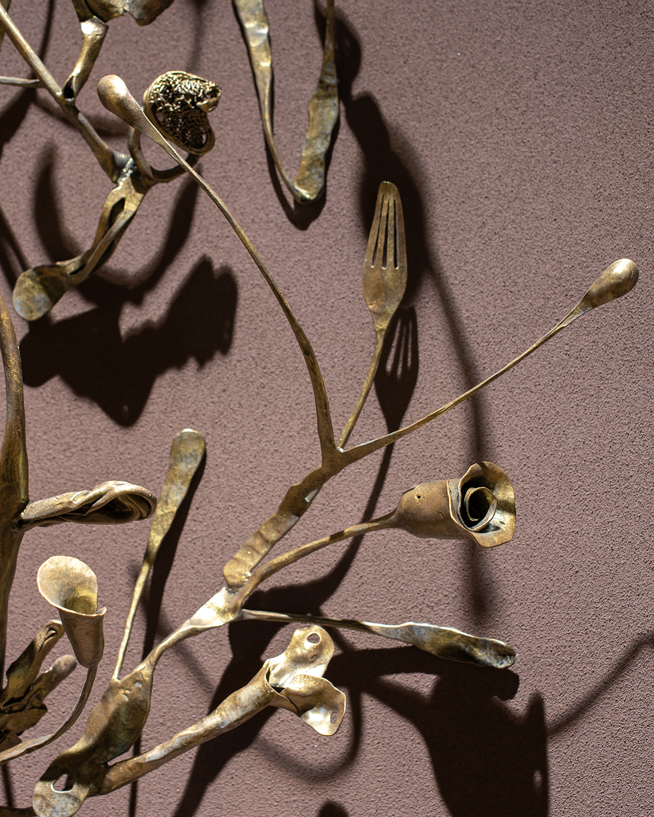 ラウンジの突き当たりに位置するこのレリーフは、遠くから見ると植物の姿をしている。そして近づいて見ると、様々な鉄の道具を再鍛造し、つなぎ合わせて作られたことに気付くだろう。それらは、なんばPARKS内のテナント様が長年活用し、役目を終えた金物たちである。実際にここで使われてきたモノを叩くというリアリティは特別感を生み出し、「ここで働く人々を癒す」という、新たな役割を担う。