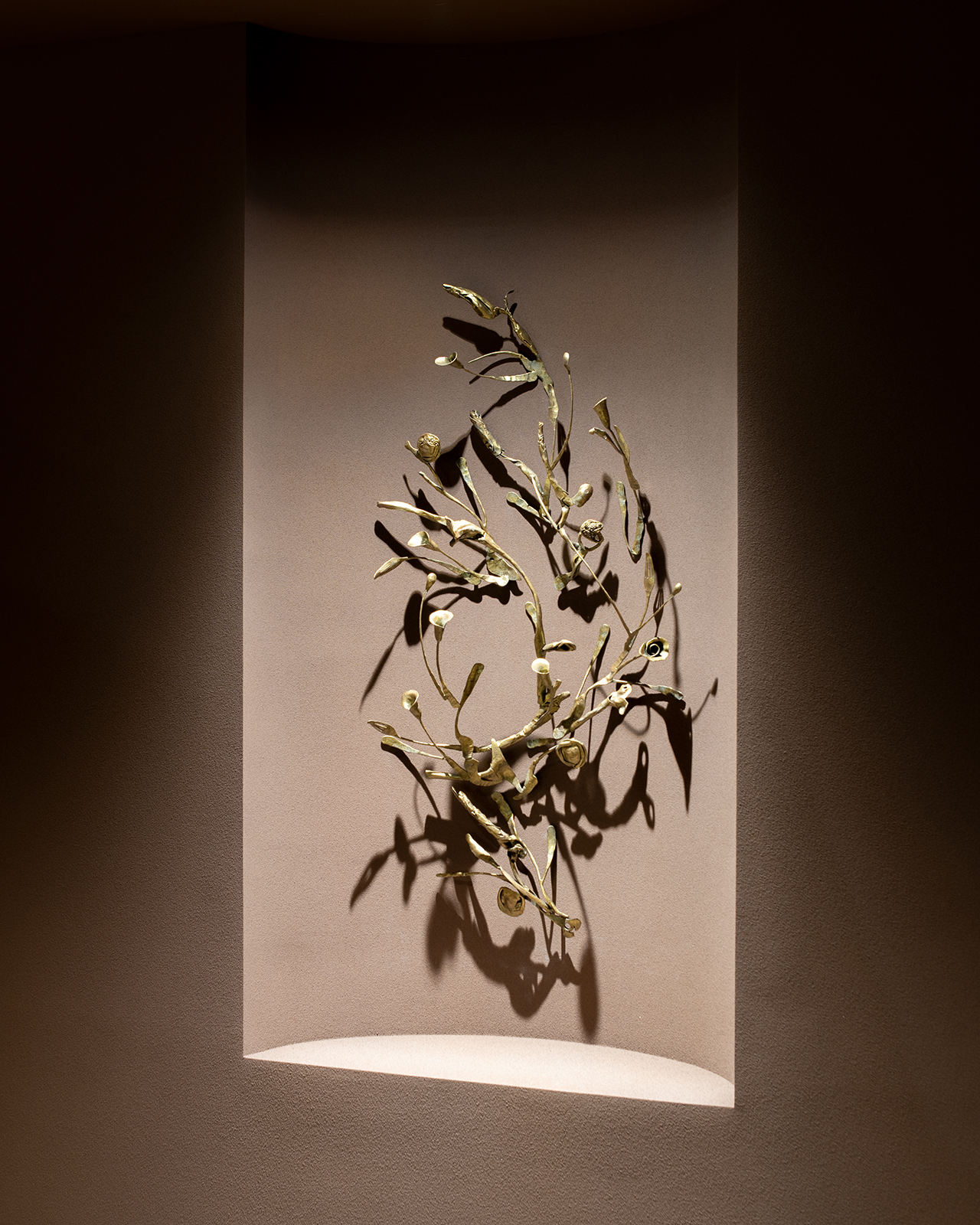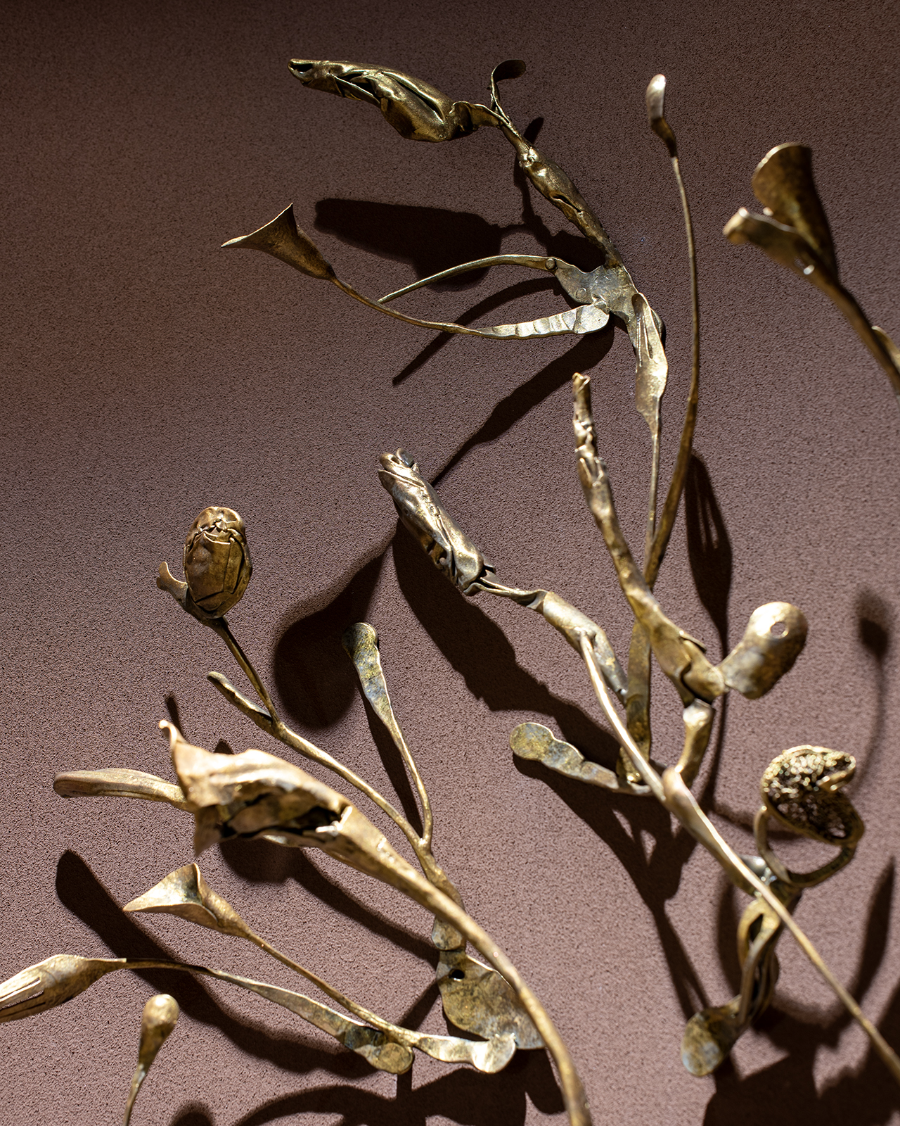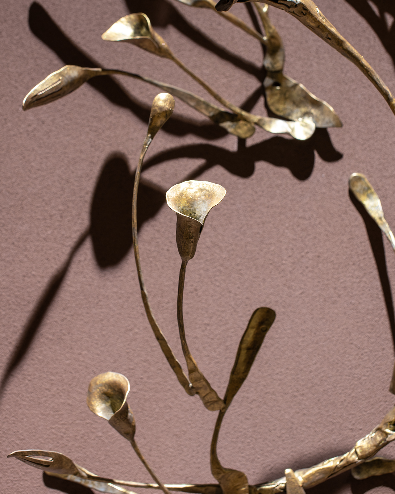 ラウンジの突き当たりに位置するこのレリーフは、遠くから見ると植物の姿をしている。そして近づいて見ると、様々な鉄の道具を再鍛造し、つなぎ合わせて作られたことに気付くだろう。それらは、なんばPARKS内のテナント様が長年活用し、役目を終えた金物たちである。実際にここで使われてきたモノを叩くというリアリティは特別感を生み出し、「ここで働く人々を癒す」という、新たな役割を担う。